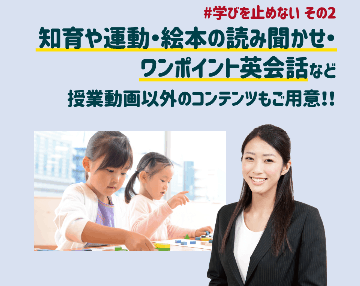 こちら、受講生限定で知育、運動、絵本の読み聞かせ(日本語、ネイティブ英会話)などのコンテンツを無料で配信しています。