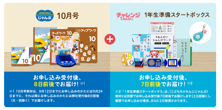 | 新一年生教材特典 | ・通常の教材に加えて、内容充実の「1年生準備スタートボックス」がもらえる 目覚ましコラショ(デジタル・アナログを音声で伝えるキャラクター目覚まし時計) 3WAY勉強マシン(勉強のモチベーションを上げるツール) チャレンジスタートナビ(690問収録のミニタブレット) |