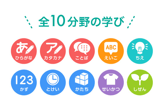 | 教材 | タブレット学習(ひらがな、ことば、かず、とけい、かたち、えいご、ちえ、せいかつ、しぜん、英語プレミアム) |