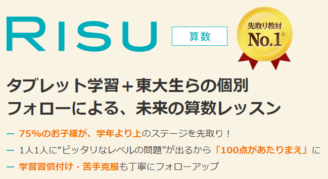 公文は間違いなく結果を出してきた教室、教材と考えますが、RISUは公文の弱点を補う形で、計算以外の論理的思考も養いながら先取りできるカリキュラムです。更に、東大生のフォローも受けられるという点で、間違いない指導も受けられます。また、RISUきっずが終わった後は小学生向けのRISU算数に入り、公文に負けない先取り学習が可能です。