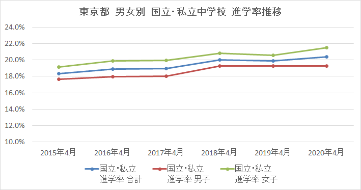 本日は2020年4月の東京都教育委員会が開示している小学校卒業生の進路実績を基に、男女別に進路の傾向をアップデートしたいと思います。よく全体としての推移は学習塾で開示されていますが、男女別はあまりないのではないかと思います。