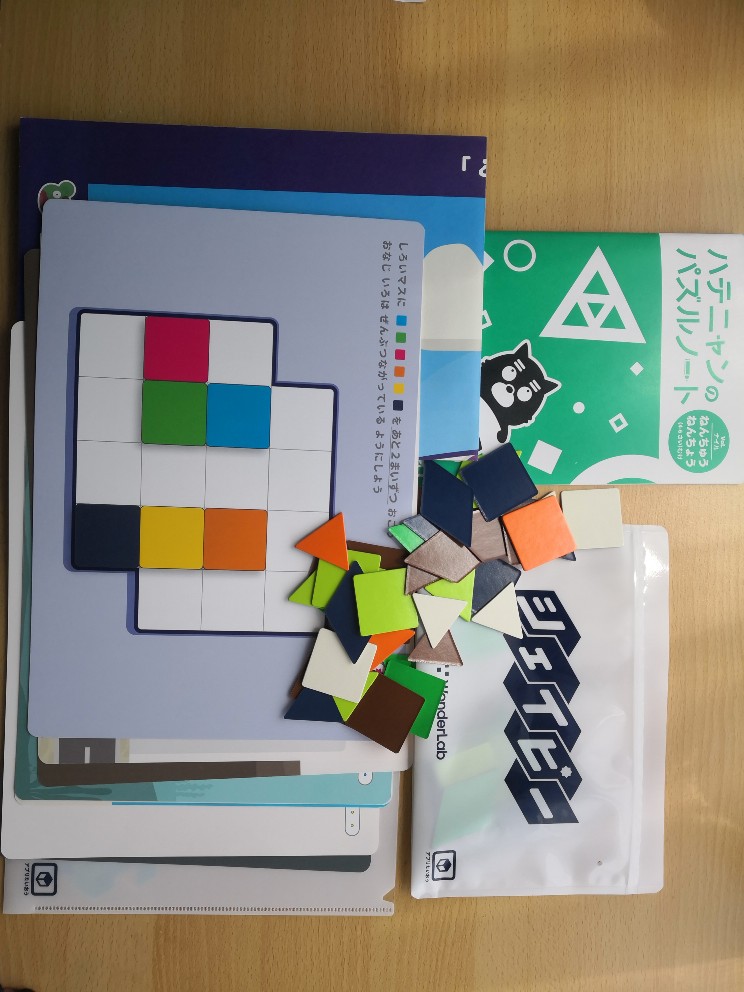 こちら、7冊構成で、冊子の上にタングラムをしいて取り組んでいきます。