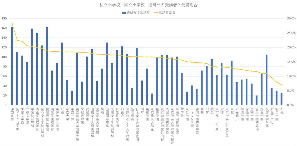 更に、国立学園や宝仙など、ほとんどが中学受験をする私立小学校も受講率が低いです。