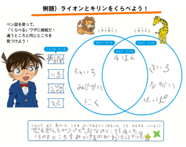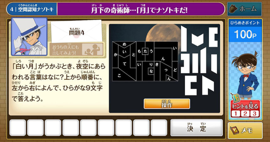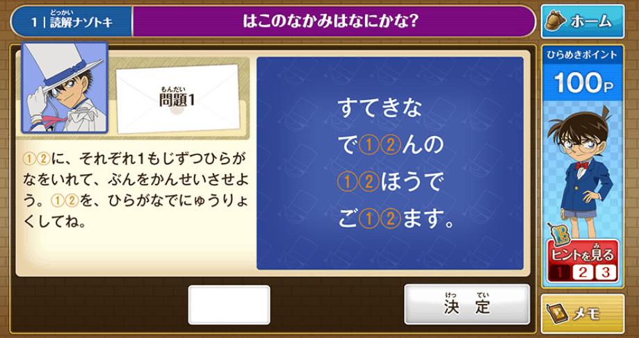 ナゾトキは低学年は下記のような取り組み。 クイズ形式なので、親しみやすい点がポイントです。 お子様は勉強している感覚はないでしょう。これを機にコナンが好きになるお子様も増えるでしょうね。