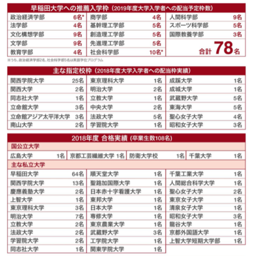 早稲田大学の近くにある系属の早稲田中学は、298名の高校卒業者に対して138名と半分弱が早稲田大学へ推薦で進学し、また毎年凡そ30名から40名が、東京大学へ合格します。その他、旧帝大、慶應大への進学も多いです。