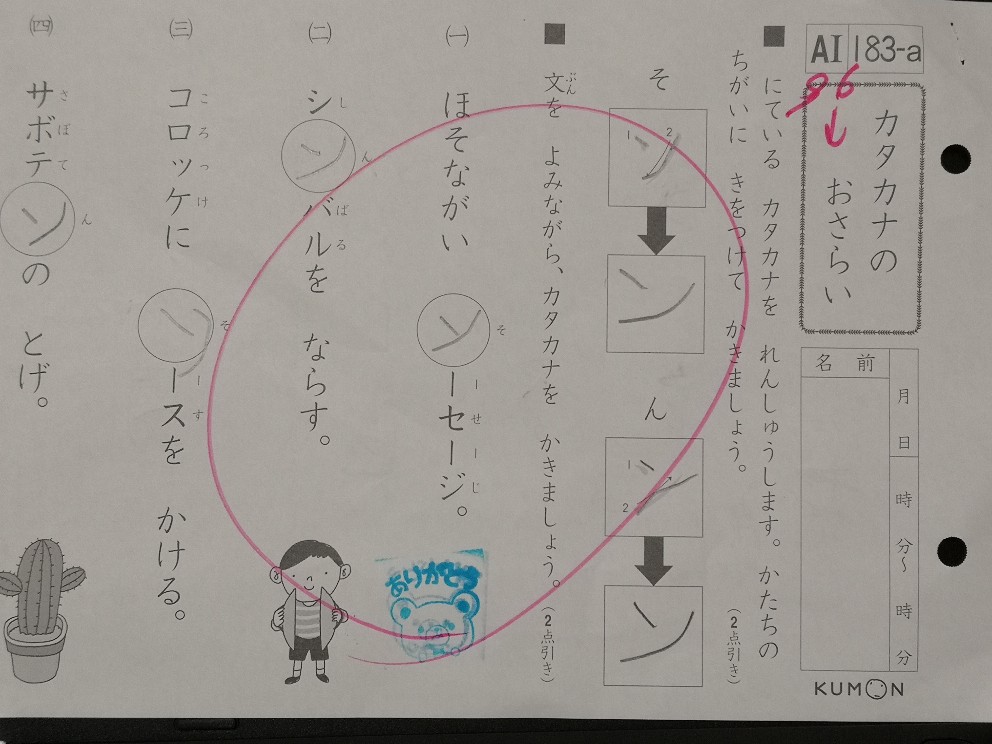課題もあります。上記の通り、カタカナの復習にて、まだまだ丁寧な記述に問題が残ります。
