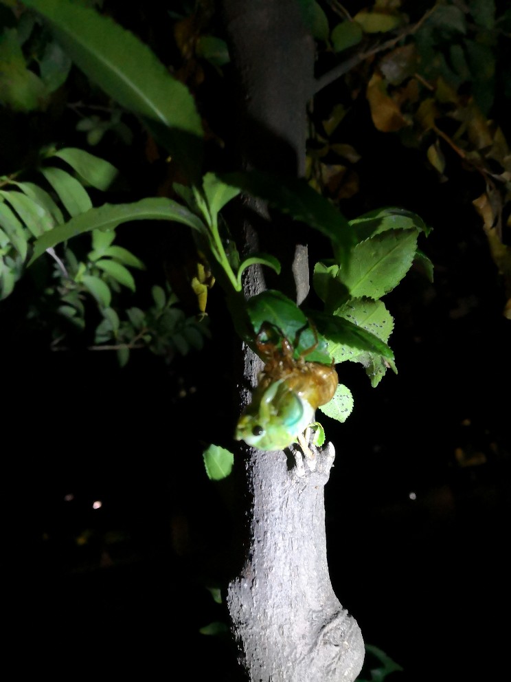 セミは夕方、薄暗くなると比較的早い時間帯から根元から登り、それぞれのタイミングで止まって、羽化します。羽化したての頃は羽が柔らかいので、固まるまでしばらくじっとしています。近づいても逃げませんので、比較的容易に羽化途中のセミを観察することができます。