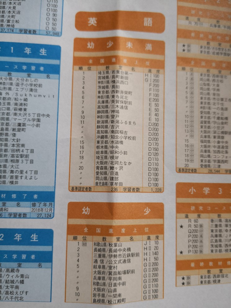 下図は英語の優秀者進捗です。非常に差が大きく、英語がネイティブレベルにできれば、算数や国語よりもどんどん先へ進めていけることが読み取れます。年長で全教材終わりそうな方がいるのが驚きです!!
