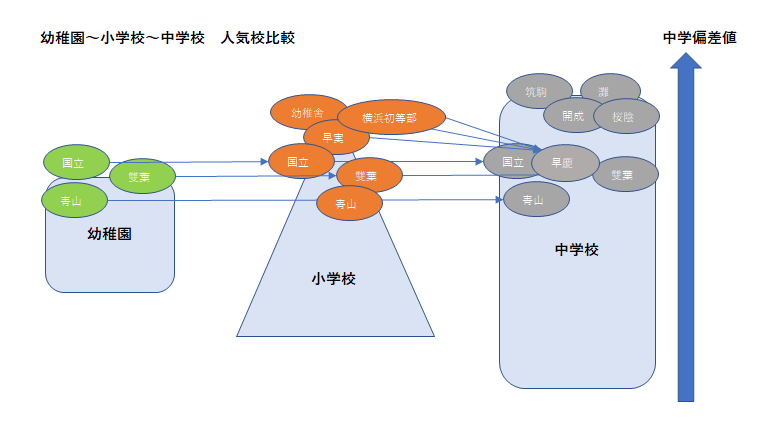 トップの画像は、幼稚園、小学校、中学校のそれぞれの難関校を抽出して偏差値順に並べつつ、横並びにした自作の表です。