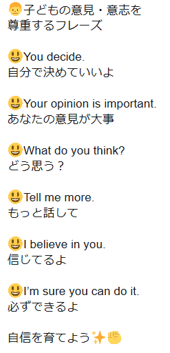 今回、Carleyさんより「子どもの意見・意志を尊重するフレーズ」を頂きましたので、ご紹介させて頂きます。