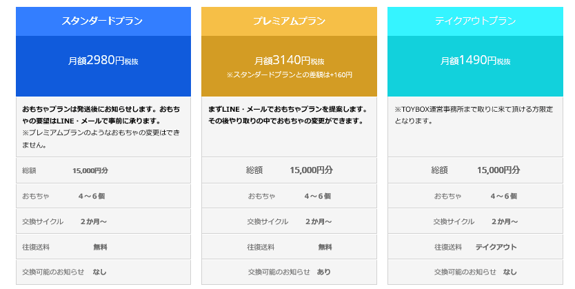気に入ったら延長もできます。料金は下記3コースですが、スタンダードとプレミアムの料金が変わらないので、事前におもちゃの内容についてやり取りができるプレミアムプランがおすすめです。