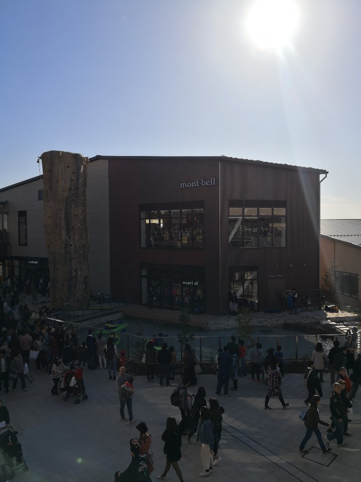 こちら、グランベリーパークのメイン施設となっている場所の一つです。国内最大級のモンベルストアの横に人工池とクライミング体験用の大きなウォールがあり、アウトドア体験を格安に楽しめます。