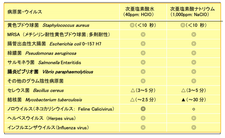● 厚生労働省発表の【次亜塩素酸水と次亜塩素酸ナトリウムの同類性に関する資料】では、次亜塩素酸水(HCIO)は、次亜塩素酸ナトリウム(ClO-)より約 80 倍高い殺菌力があり、インフルエンザウイルス等のエンベロープウイルス、ノロウイルスなどのノンエンベロープウイルスを10秒以内に抗菌化すると明記されていること。